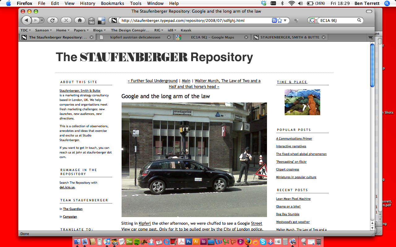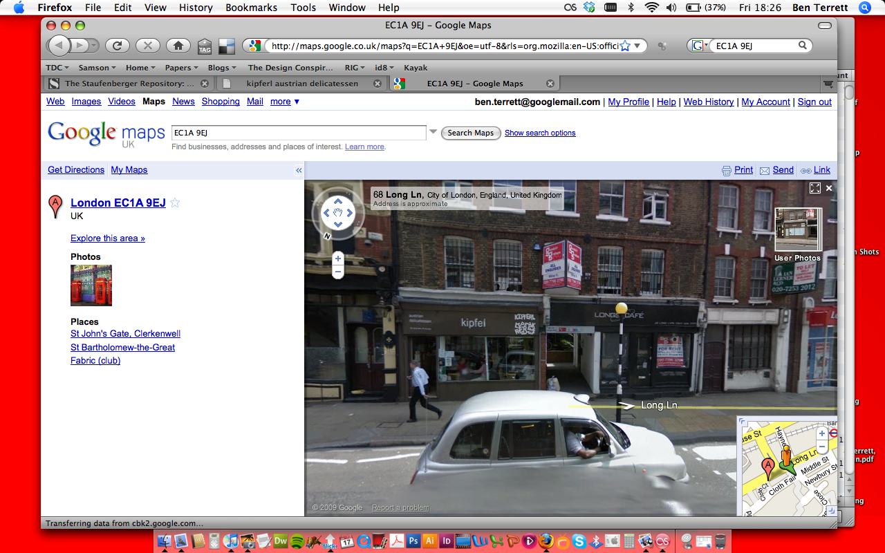 "Sitting in Kipferl the other afternoon, we were chuffed to see a Google Street View car come past. Only for it to be pulled over by the City of London police. After a brief conversation through the window, the driver got out, turned off the camera and waited while the copper took a long time to make some enquiries.
