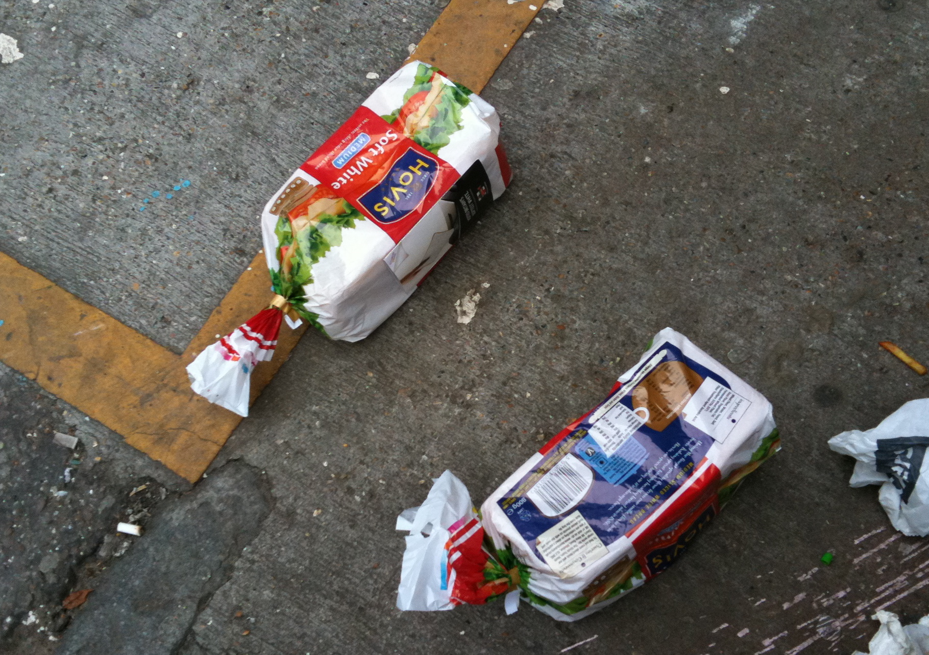 This food staple was being handed out at Liverpool St. home of London's finance industry. I know there's been a banking crisis, but I'm confident the commuters rushing through that station can afford a loaf of bread.