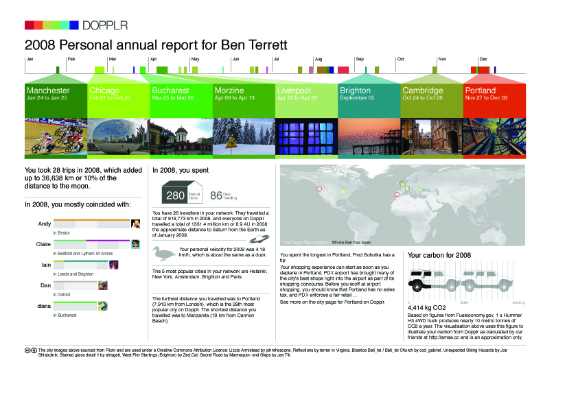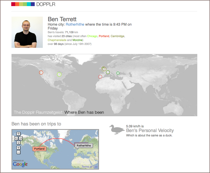 Matt and Matt often talk about creating a website you never have to visit. I love this idea. They're starting to build it. For example, if you book a trip with BA (or any airline) simply forward the email itinerary Dopplr and it will automatically update your page. If you're suddenly taking a last minute one day trip to Manchester, send Dopplr's Twitter account a DM Tweet and it will add the trip for you. You don't even have to go to Dopplr to see your trips, you load them directly into iCal. Smart stuff.