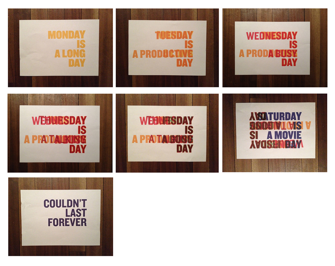 This project is about process. Michael told me he gives the brief to teach students what work is like and to help them develop ways to cope with that. Repeating a design operation every day whether you want to or not. Doing it when the ideas are flowing and then doing it when the ink has tried up and the computer doesn't work and the client hates everything. Doing it late on the train. And then doing that all over again the next day. That, after all, is what work can be like.