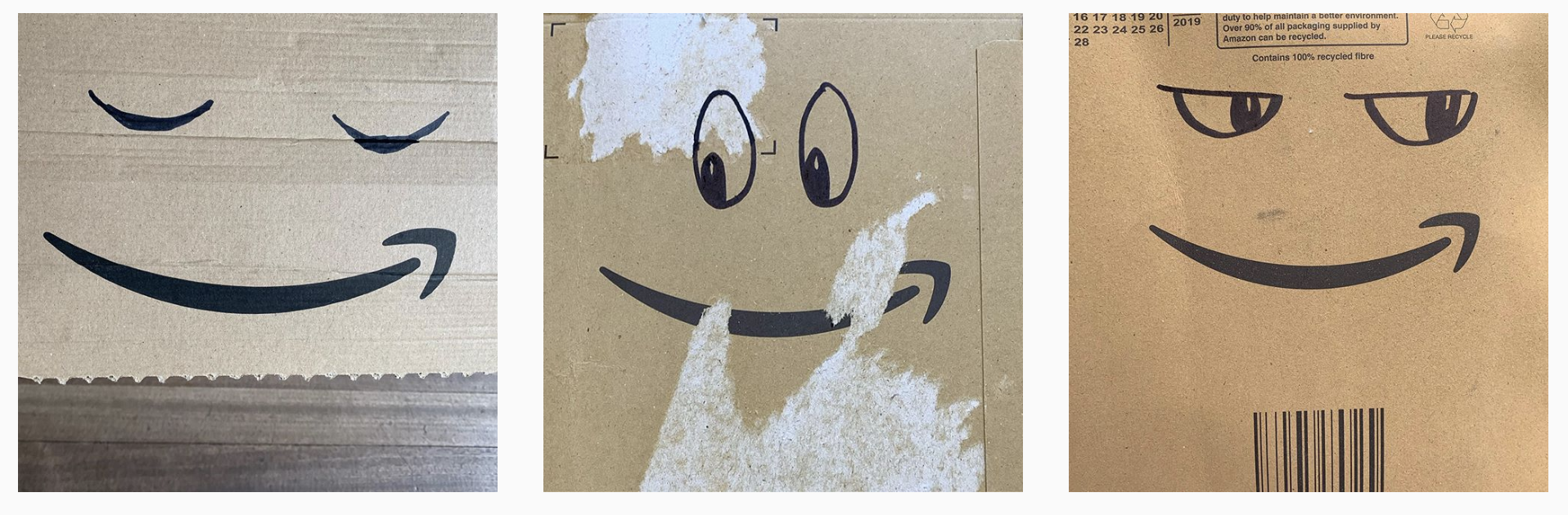 Inspired by Alan I started drawing on the Amazon boxes we had at home. I started adding eyes to the smile. Here are the first few. Like all good side projects I started an Insta @eyesonamazon.