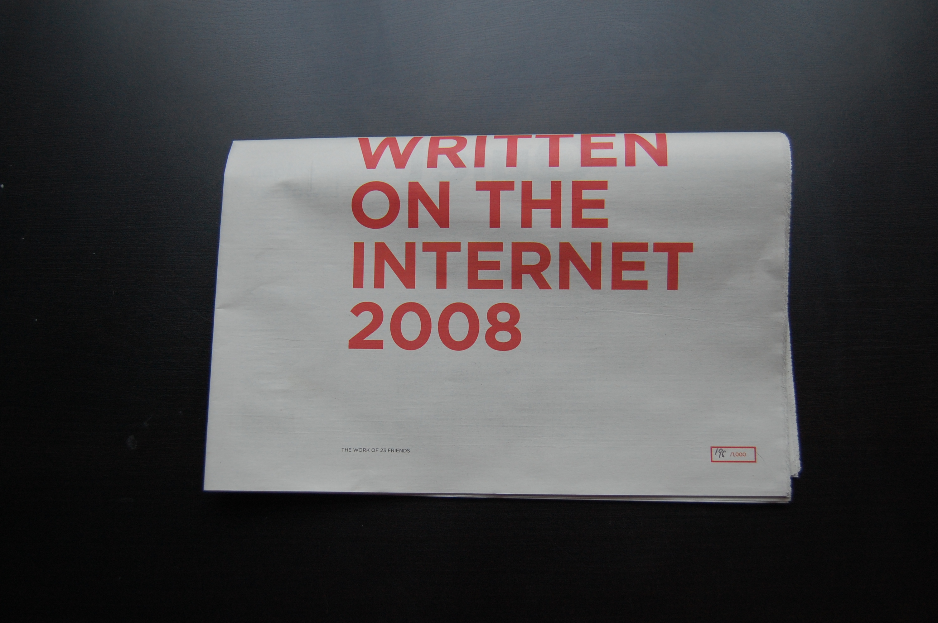 The cover is set in Gotham, because that was the font used throughout the Obama campaign and obviously the font of last year. It's in 96pt becuase that was the super size the NYT used when Obama got elected. It folds over to be read as two halves because Russell was speaking at a Guardian conference and I thought it would look cool if he held up the Written On The Internet 2008 half.