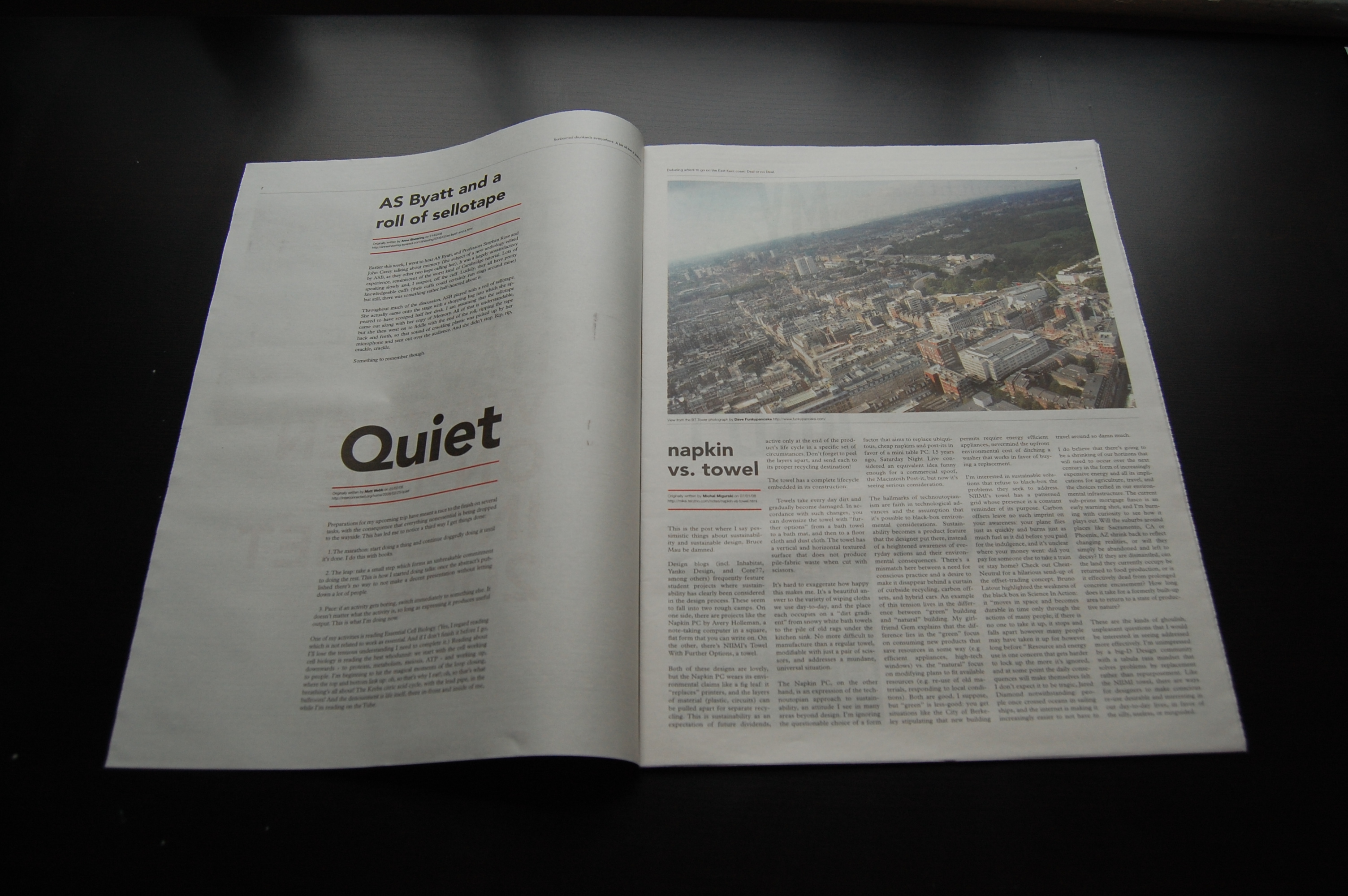 I very quickly realised how important ads are to a newspaper. And not just for monetary reasons. They usefully fill all those awkward little spaces where there's no text. Without them the document feels dull and lifeless. Unpunctuated like a copy of Ulysses. Too much text. A lot of the posts had pictures, but where they didn't we used pictures from Flickr or just white space. Again I wanted it to be like a newspaper, without pastiching a newspaper.