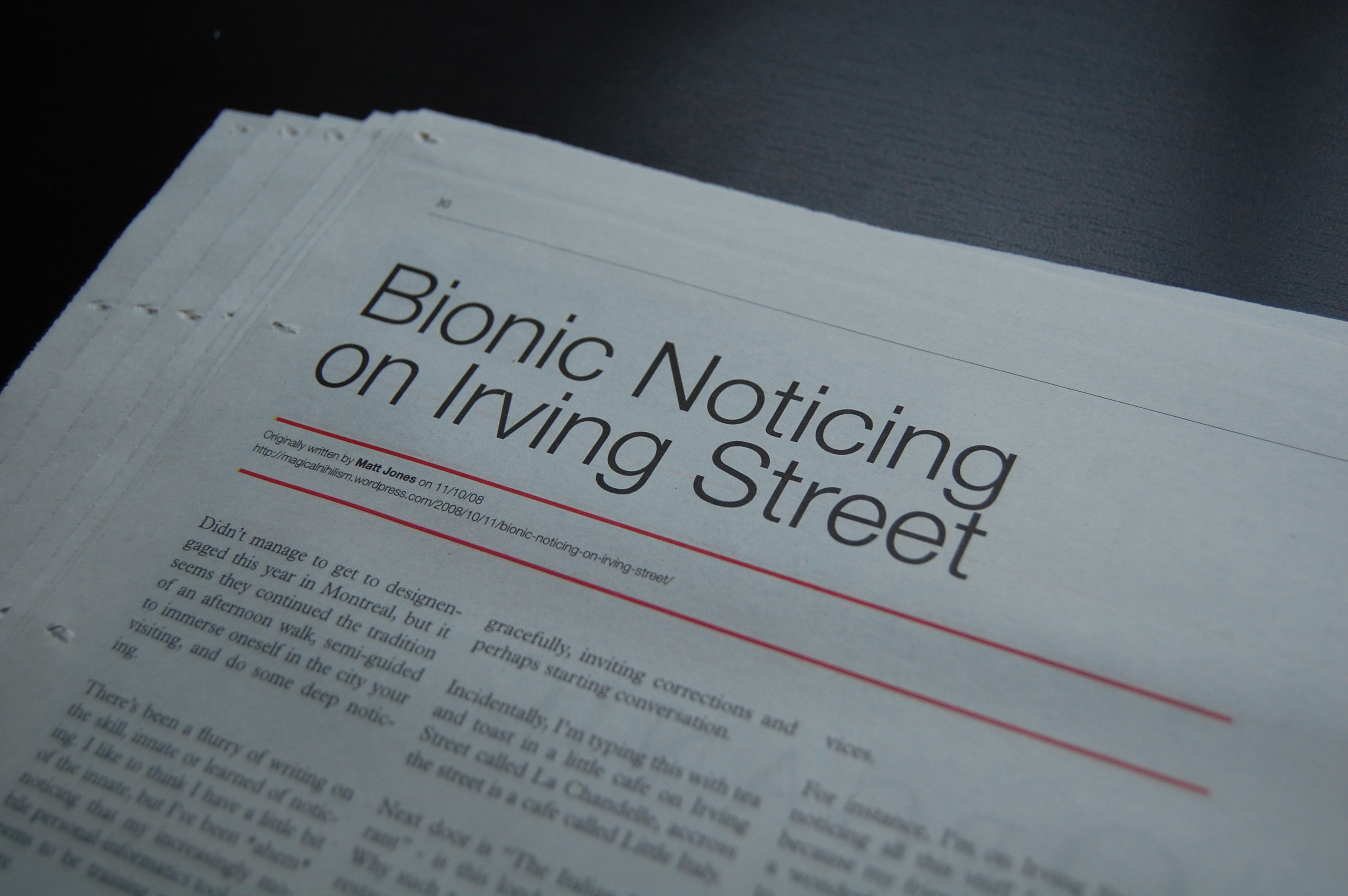 We didn't edit any posts at all. So they're full of typos and a lot of the columns end in strange places. This is an odd phenomenon. In a real publication the Sub Editor would shout for a few less (or more) words to make it fit just right. No sub editing here. But as Jeremy points out "The result is a tidy but raw blog-like feel that deals with presentation in a very matter-of-fact manner." That's more eloquent than I could have put it, but that's exactly what I was going for.