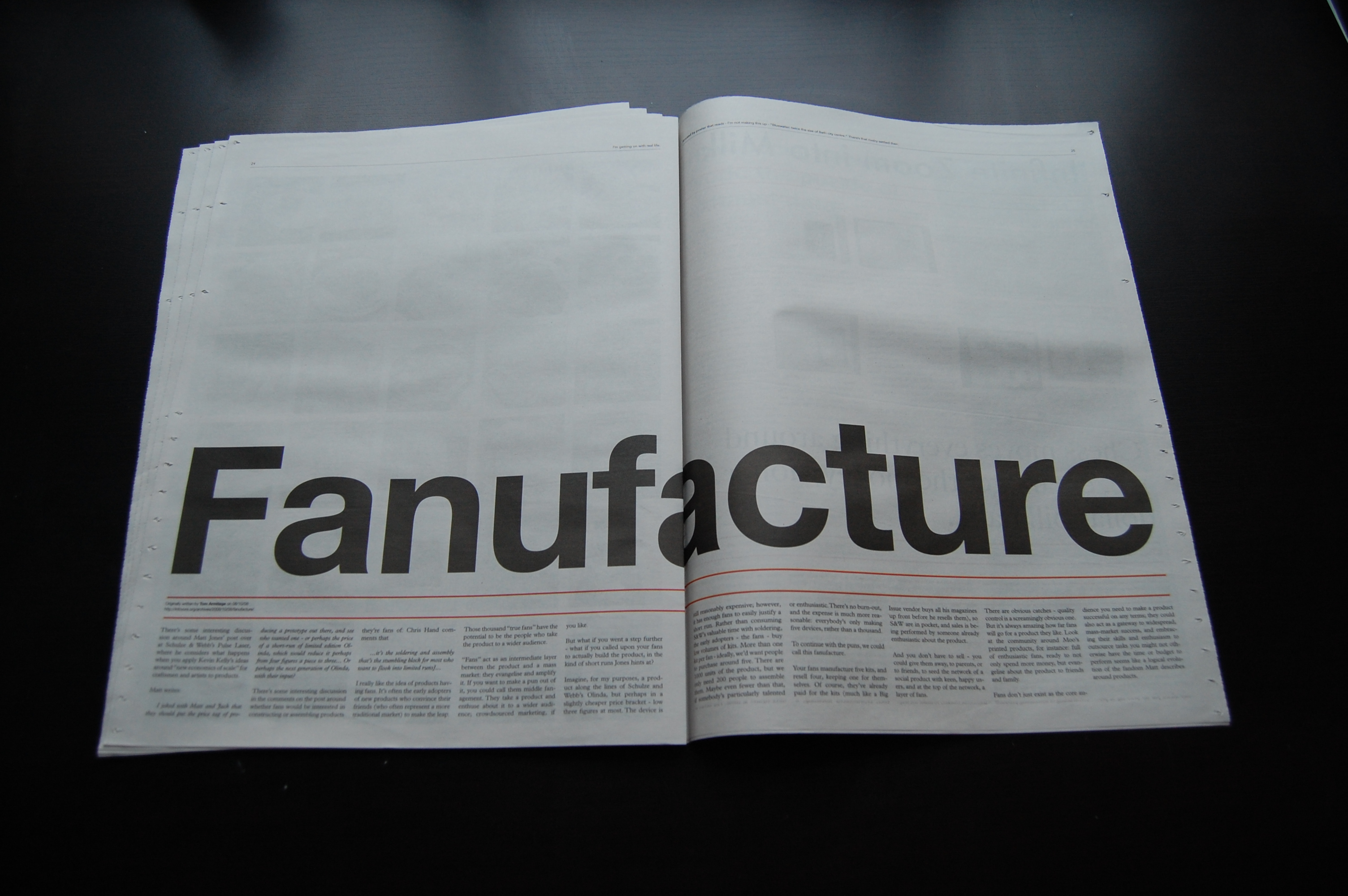 Russell and I thought it would be interesting to take some stuff from the internet and print it in a newspaper format. Words as well as pictures. Like a Daily Me, but slower. When we discovered that most newspaper printers will let you do a short run on their press (this was exactly the same spec as the News Of The World) we decided to have some fun.
